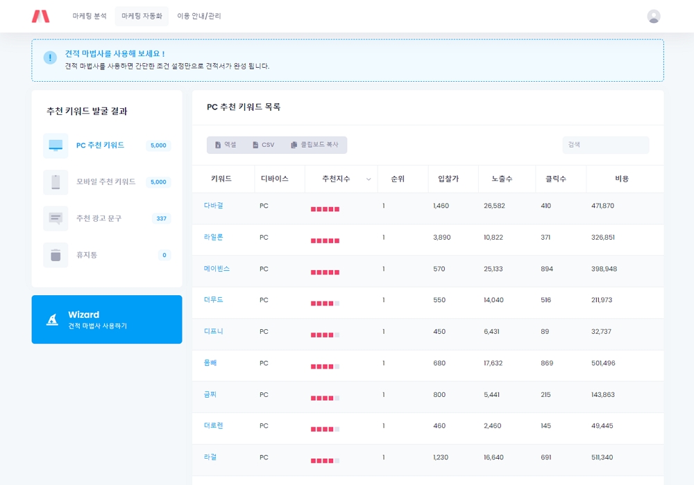추출되는 키워드별로 추천지수가 상당히 정확한것 같습니다. 그리고 견적 마법사까지 사용하면 3분만에 키워드 추출과 견적서 작업의 완료가 가능합니다.