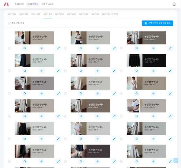 상세페이지 URL만 입력하면 올어바웃애드의 인공지능이 URL을 분석하여 9가지 사이즈의 구글광고 이미지 소재를 자동으로 만들어 드립니다.