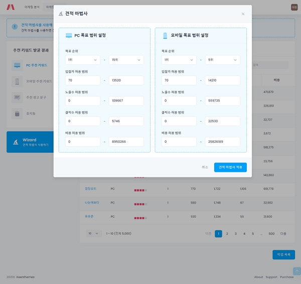 올어바웃애드의 인공지능이 사이트의 서비스, 판매 상품을 분석하고 경쟁사와의 경쟁 관계를 고려하여 추천 키워드를 추출 합니다.