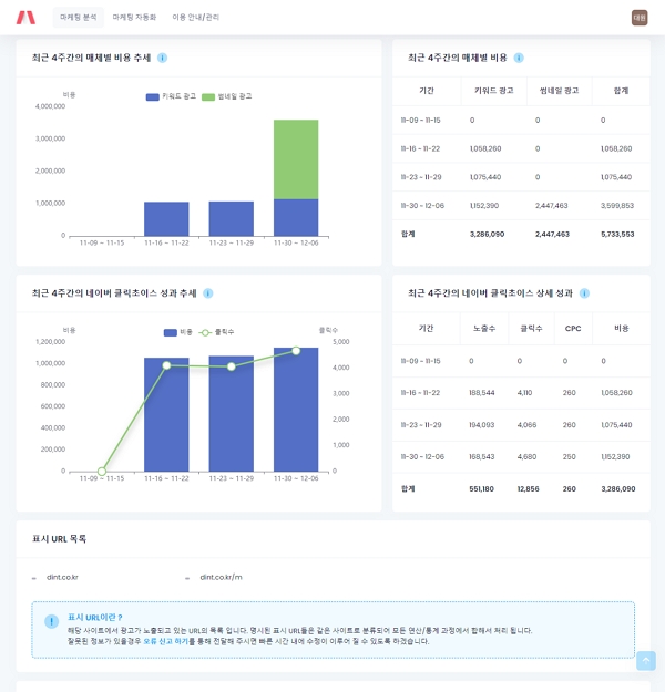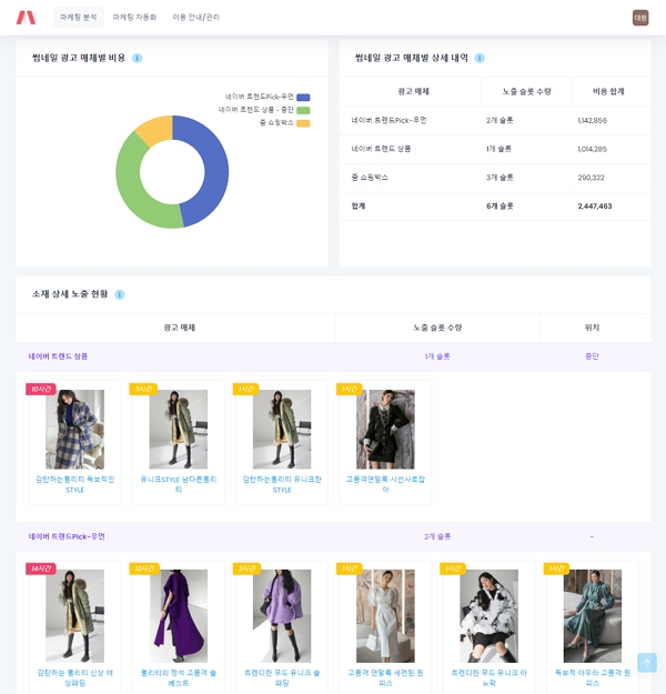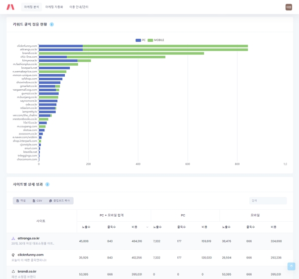 사이트별 매체 믹스 현황의 확인이 가능하며 국내 주요 광고 매체의 상세 성과와 노출 소재의 이력 확인이 가능합니다.