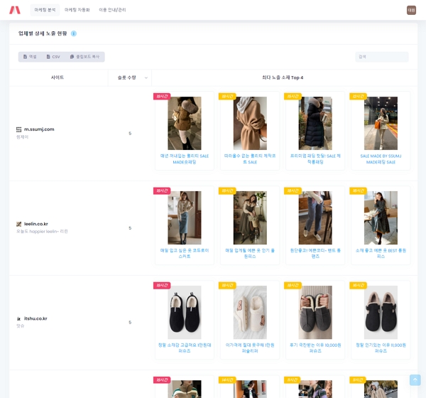 썸네일 광고 매체별로 입찰중인 업체, 슬롯 수량, 노출 소재의 통계 정보등이 제공되며 광고 문구의 형태소 통계 정보도 확인 가능합니다.