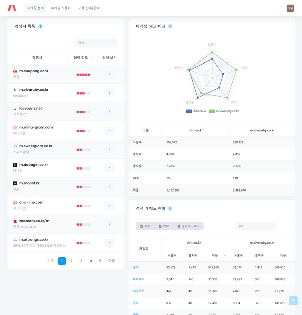 마케팅 시장에서의 경쟁 관계를 파악할 수 있고 상세 경쟁 내역까지 확인할 수 있습니다.