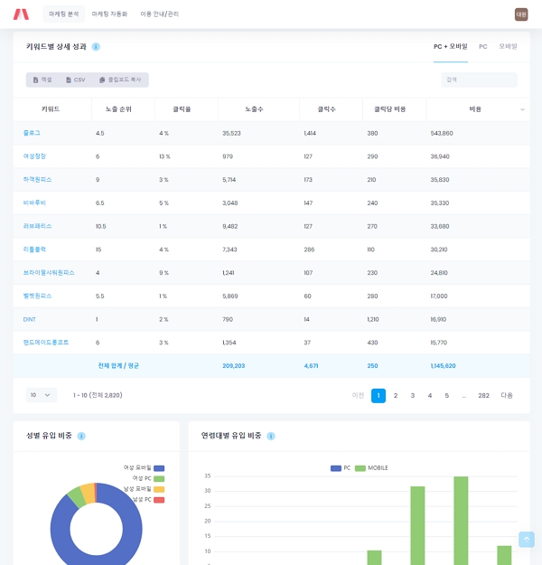 클릭 점유율, 입찰 업체별 상세 성과, 광고 문구, 인구통계 분석 정보, 견적 정보 등을 키워드 단위로 확인할 수 있습니다.